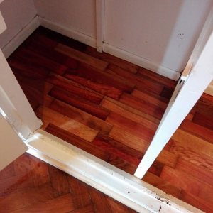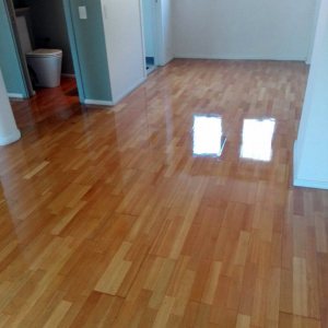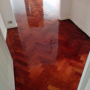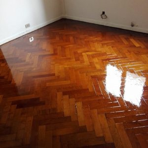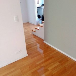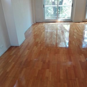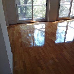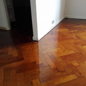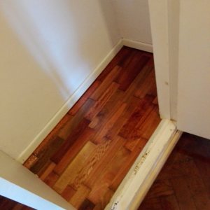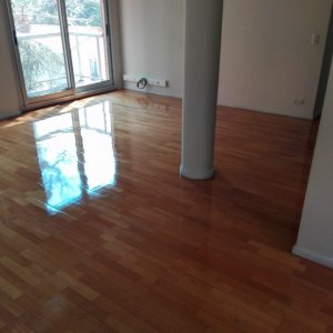 Antes: retiro de alfombra, retiro de parquet de placard para reparar en dormitorio. Después: Colocación de parquet nuevo en placard, terminación del pulido y plastificado de todo el departamento.