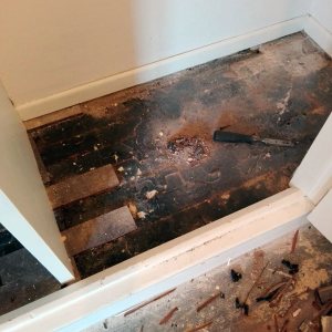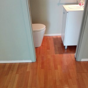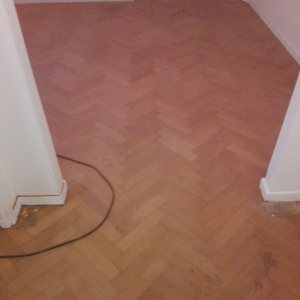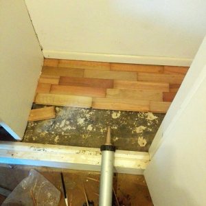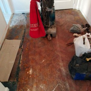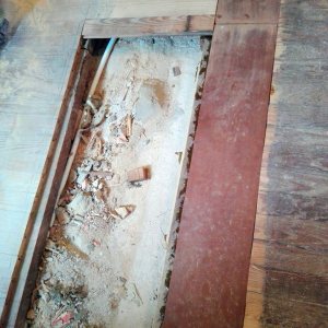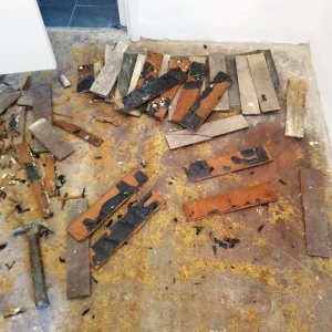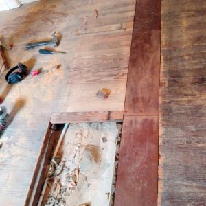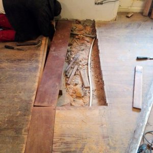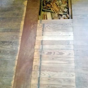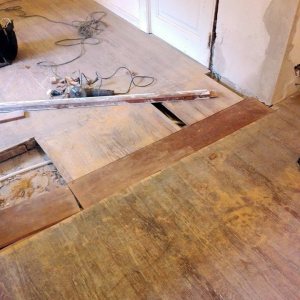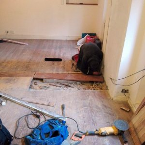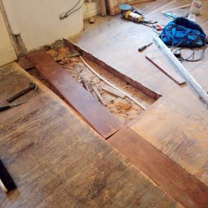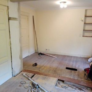Restauración de piso de pinotea antiguo, unificación de un ambiente con otro por retiro de pared divisoria.
