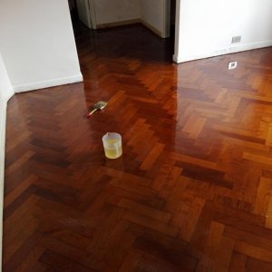 Se aplican tres manos de laca poliuretanica para pisos, sin diluir